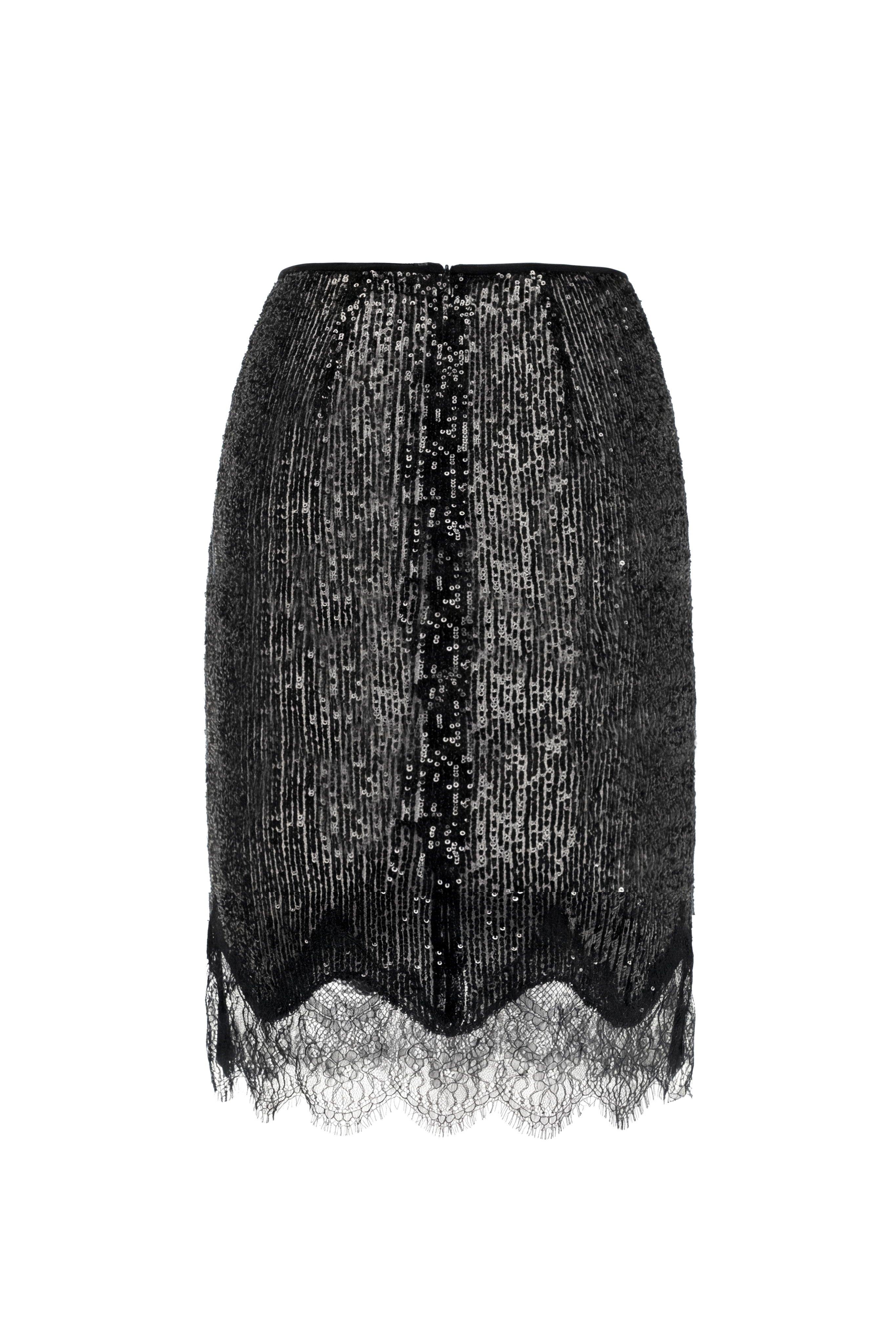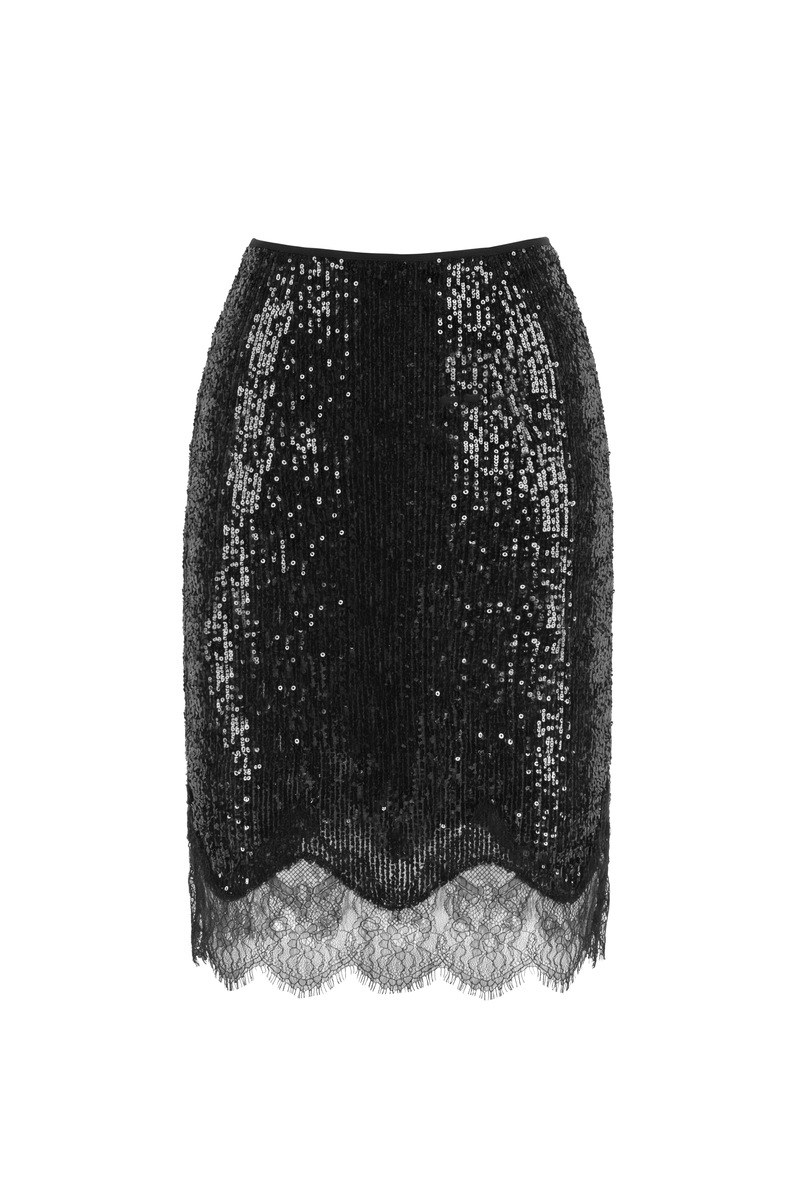 Эффектная юбка из чёрных пайеток с изящной кружевной отделкой по низу. Длина до колена и приталенный силуэт подчёркивают фигуру, а сочетание блеска и кружева придаёт образу женственность и элегантность. Идеальный выбор для вечерних выходов и особых случаев.