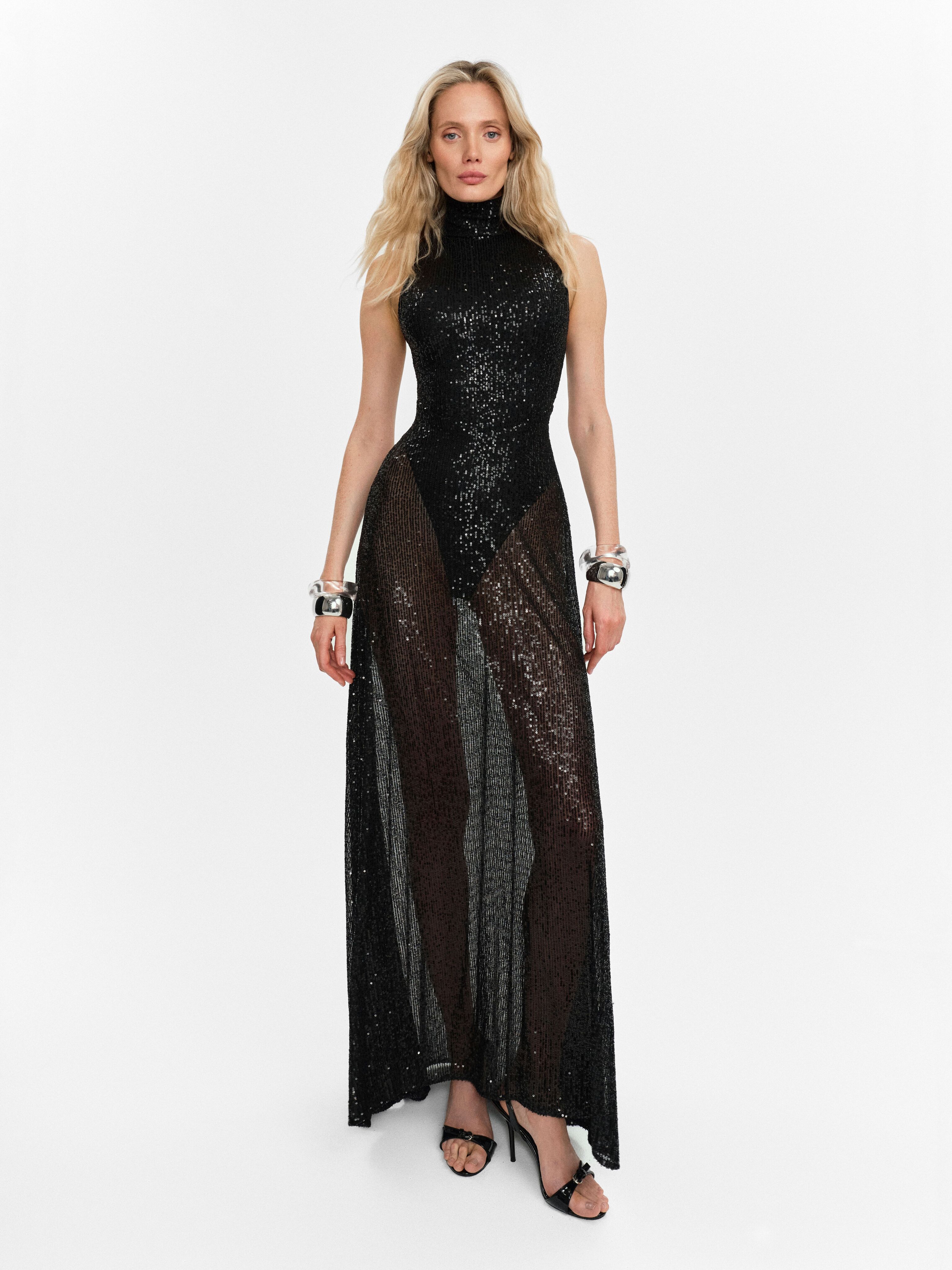 Платье халтер с воротником стойка выполнено из мерцающих пайеток, которые создают эффектный блеск при каждом движении.