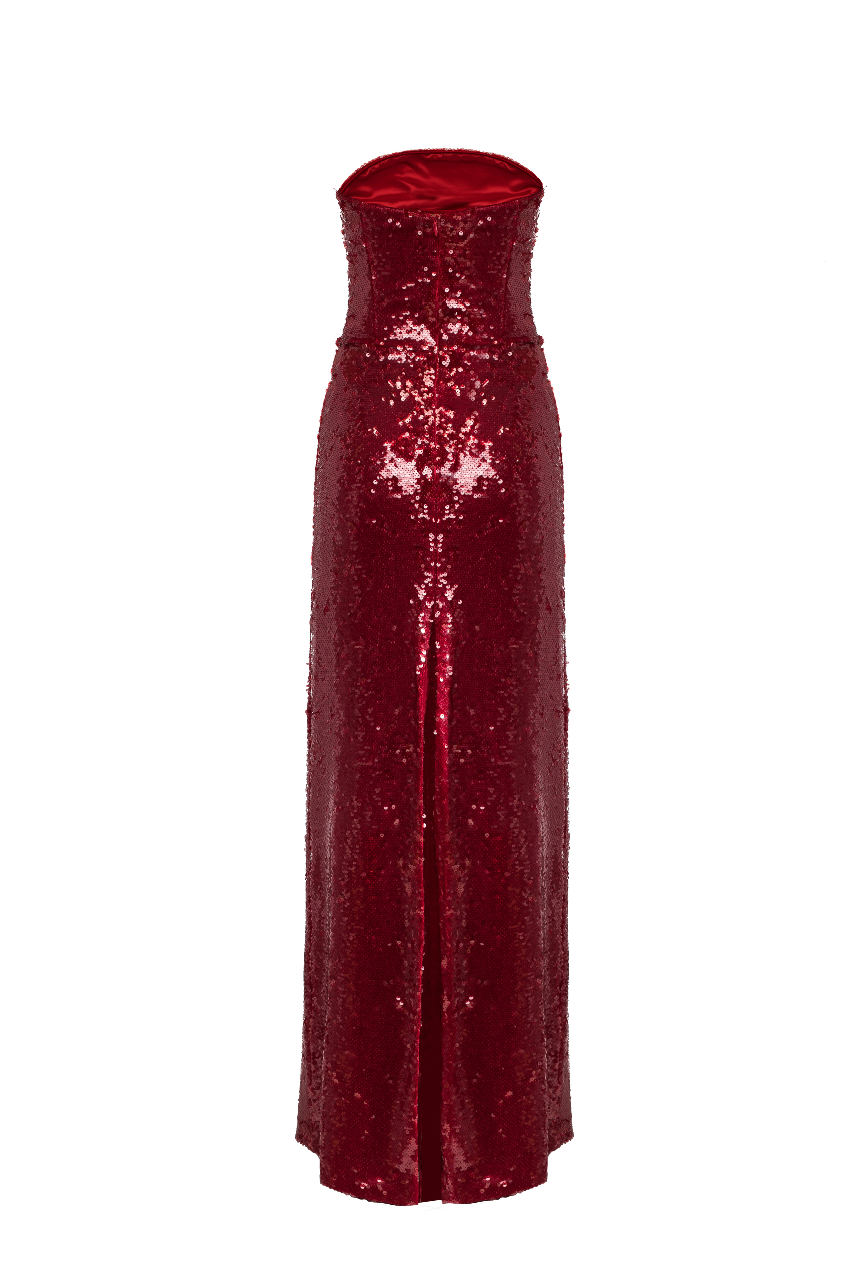 Эффектное вечернее платье-футляр из мерцающих пайеток насыщенного красного оттенка.