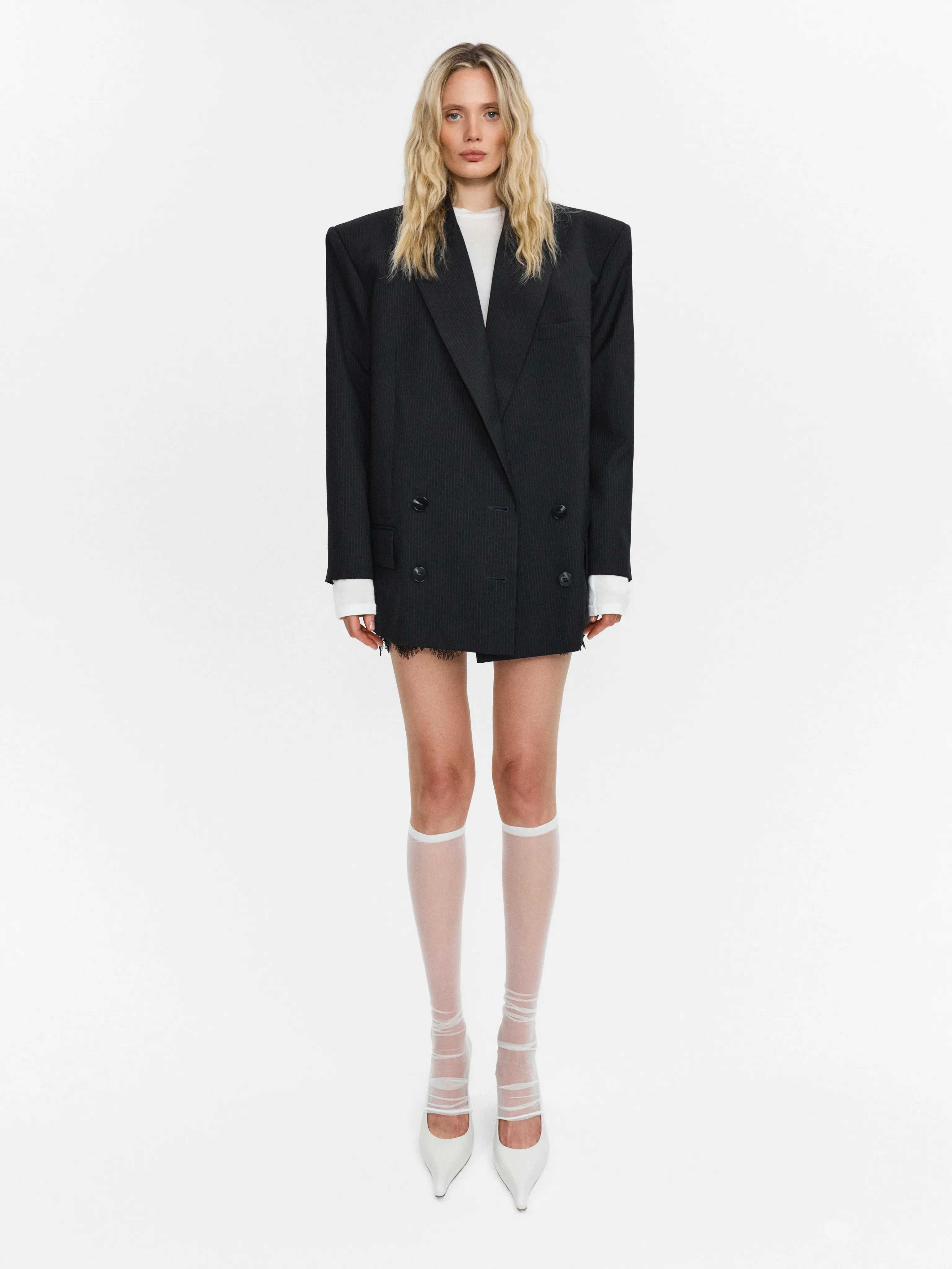 "Striped wool trousers" - широкие брюки в полоску со складками.